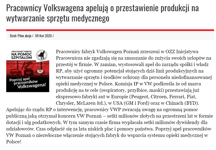 Z kolei w Poznaniu protestowali członkowie Inicjatywy Pracowniczej w Volkswagenie Poznań. Chcą by fabryka wykorzystała swoje moce na produkcję respiratorów, przyłbic i masek.