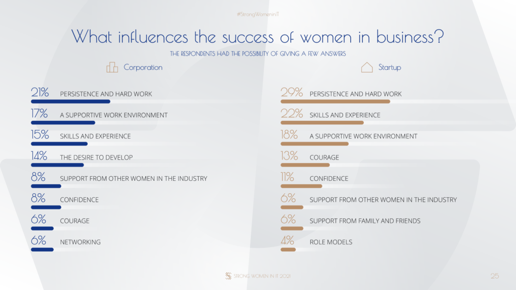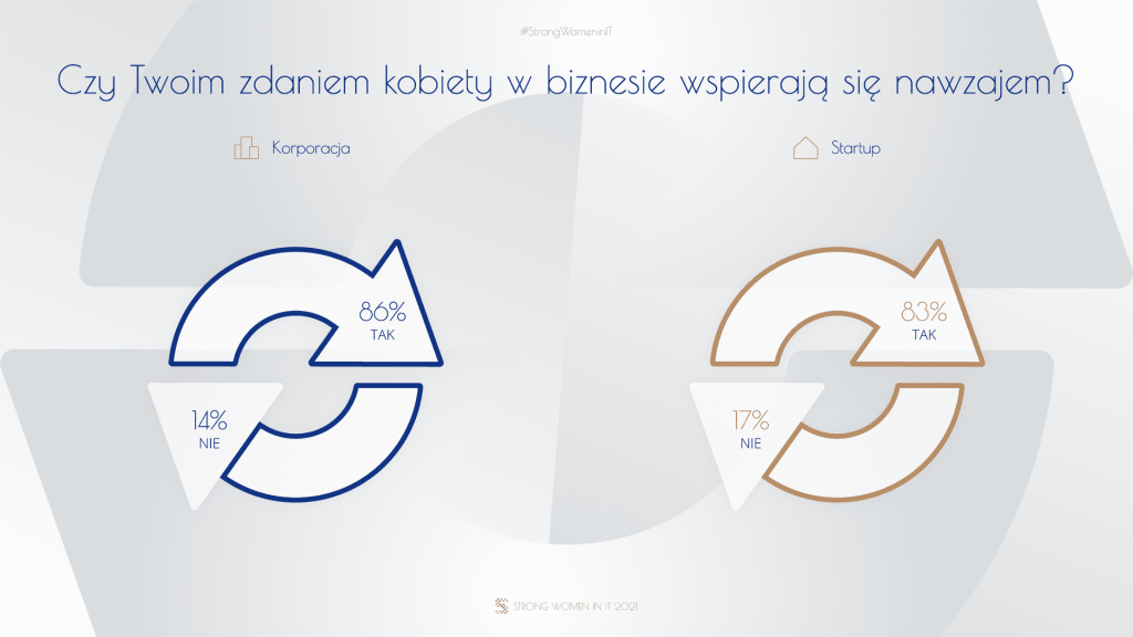 W wywiadach strong women często podkreślają znaczenie wsparcia ze strony współpracowników, w tym mężczyzn, stanowiących zdecydowaną większość, zwłaszcza na wczesnych etapach kariery. Niezależnie od powyższego, kobiety sukcesu widzą przyszłość we wzajemnym wspieraniu się i siostrzeństwie. Respondentki wykazują wyjątkową zgodność w tej materii – w obu grupach aż ponad 80% z nich uważa, że kobiety w branży wspierają się nawzajem, a wsparcie dla innych deklarują prawie wszystkie ankietowane (ponad 90%). Obserwujemy w tym względzie wyraźną tendencję wzrostową w stosunku do poprzedniej edycji badania (w 2019 takie wsparcie deklarowało odpowiednio ponad trzy czwarte reprezentantek startupów i około połowa przedstawicielek korporacji).