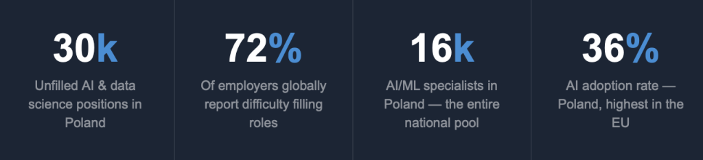 Poland is sitting on a structural time bomb. There are roughly 30,000 unfilled AI and data science positions in the country right now. That figure does not capture the roles companies haven’t yet created because they can’t fill the ones already open.