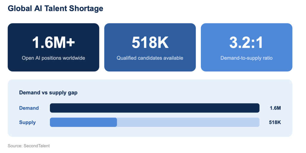 The global AI talent shortage has reached a point where demand outpaces supply by a ratio of 3.2 to 1. There is now over 1.6 million open positions and only 518,000 qualified candidates available worldwide.
