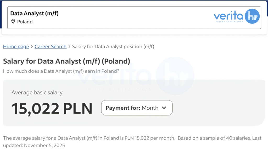 Public salary data reflects this imbalance. Indeed’s latest figures show average monthly pay of approximately PLN 15,000 gross for a data analyst role in Poland. A recent Bulldogjob-based summary of IT wages places data analysts with foreign-language skills at around PLN 9,000 gross, highlighting how international projects and English or German fluency continue to drive salary premiums. Broader compensation research estimates that the average annual salary for a Business Intelligence Analyst at roughly PLN 225,000, with senior professionals earning well above this level.